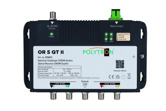 Оптический обратный преобразователь OR 5 QT II образует конечную единицу волоконно-оптической сети и преобразует сигнал световой волны обратно в исходный сигнал SAT с наземным. Откратный преобразователь выводит четыре уровня SAT и наземный сигнал и, таким образом, обеспечивает прямое подключение системы с несколькими коммутаторами. Для питания обратного преобразователя используется источник питания 18 В постоянного тока.